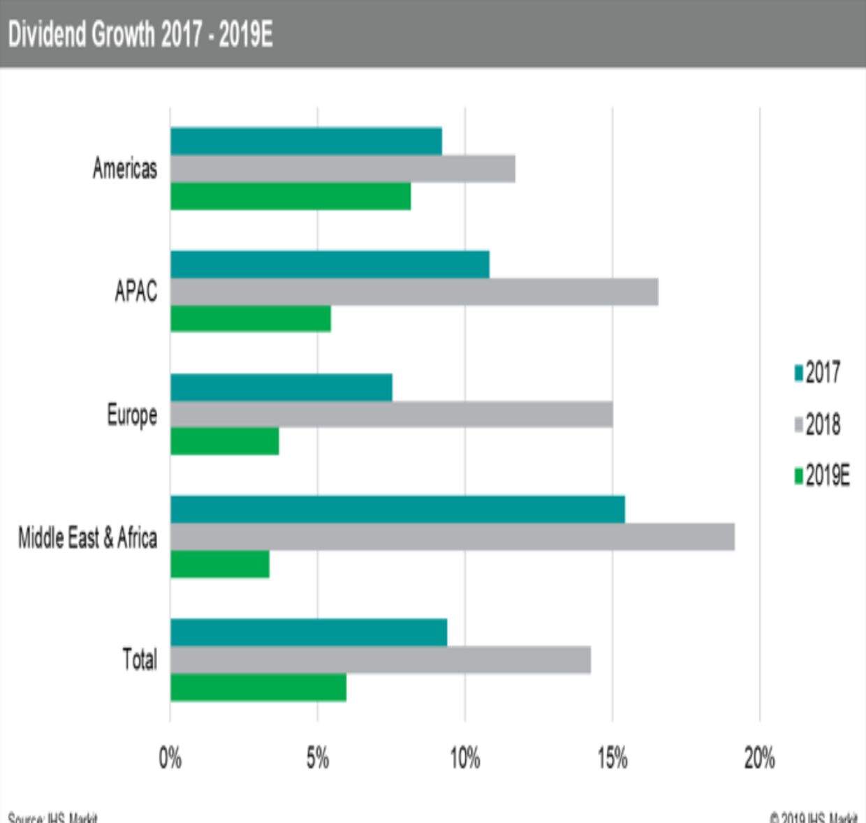 IHS Markit Ltd. last week projected a “significant slowdown” in global dividend growth this year, at 5.9%, totaling $1.8T, according to a bottom-up analysis of over 9,500 firms.