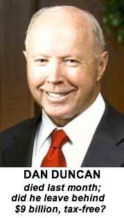 Houston gas pipeline mogul Dan Duncan was the 74th richest person in the world when he died on March 28. If he’d passed away three months earlier or ten months later, his $9 billion estate could have generated up to $4 billion for the IRS. But because there’s no federal estate tax this year, the government gets nothing.