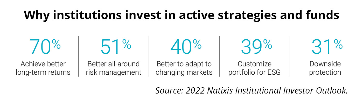 “… The rationale for active is clear in the eyes of institutional investors, as 70% say they will invest in active funds to achieve better risk-adjusted returns. Half also report that active provides better all-around risk management, and another 40% say active helps them to better adjust to changing market trends. …”