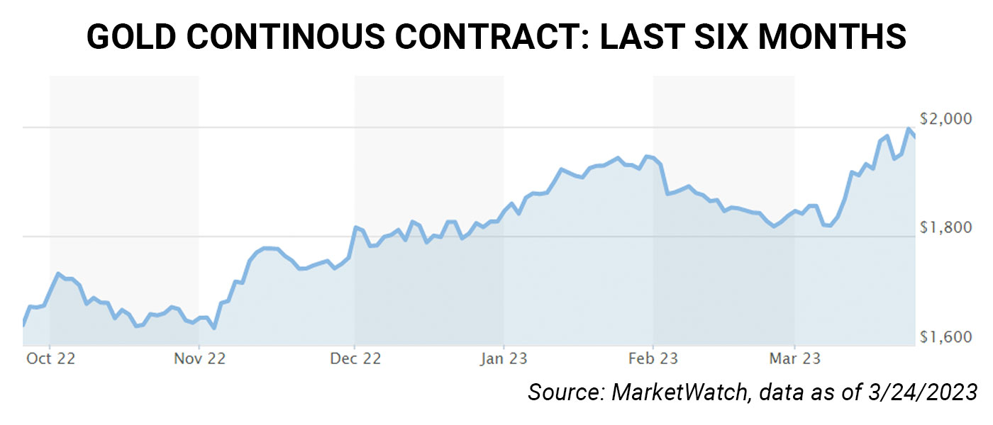 (Flexible Plan) Gold has been the topic of news and commentary throughout 2023—including the fact that the precious metal recently punched through the $2,000 level for a brief period. Gold has been on a run higher since November 2022, with the most recent gains fueled in part by concerns over the banking crisis.