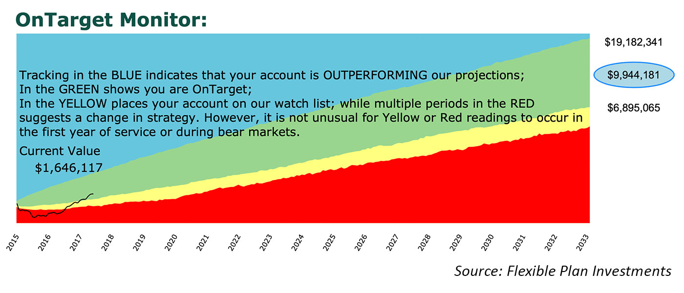 At Flexible Plan Investments, we provide you and your clients with a tool to help you stay on the correct path: your personal benchmark. Our OnTarget Monitor—included with every statement and available on our OnTarget Investing website—uses the power of statistical probability to let you know if you are on track to reach the goal established when you started investing with us. It also tells you (when it is in the red) if additional help is needed to interpret the results or adjust the plan.
