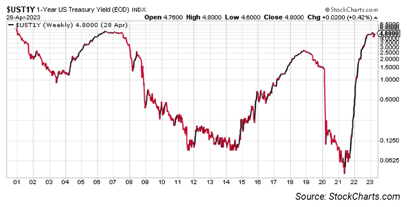 What’s catching the eyes of investors today are some of the highest short-term yields in decades. One-year Treasurys are close to 5%. This is all due to Federal Reserve tightening that has resulted in one of the fastest gains in yields in history.