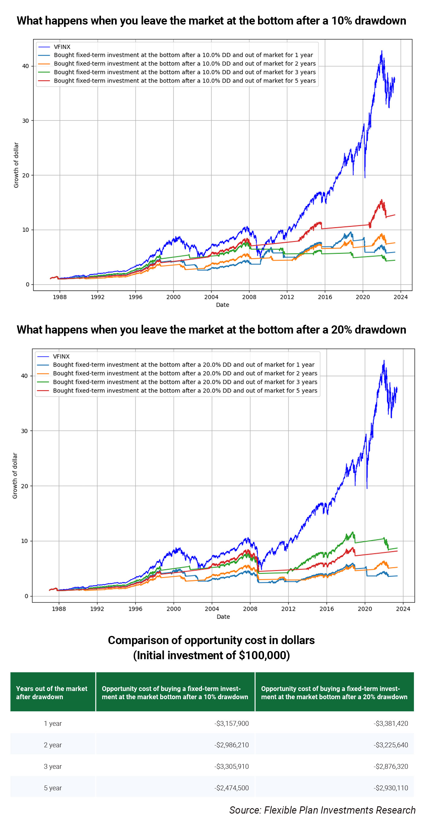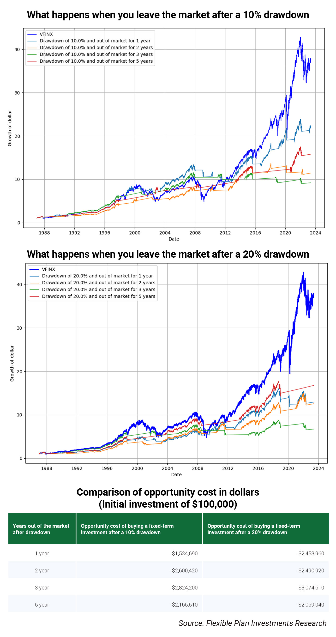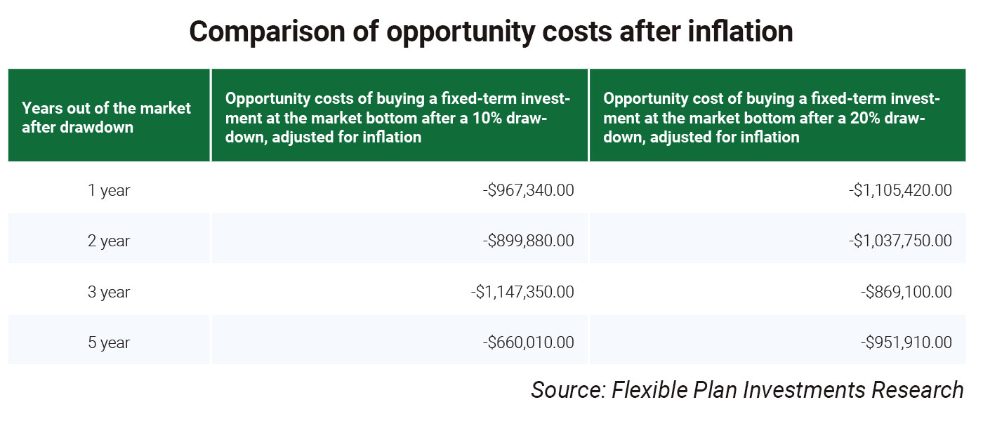• Shifting from equities to fixed-term income assets during market downturns incurs substantial opportunity costs.