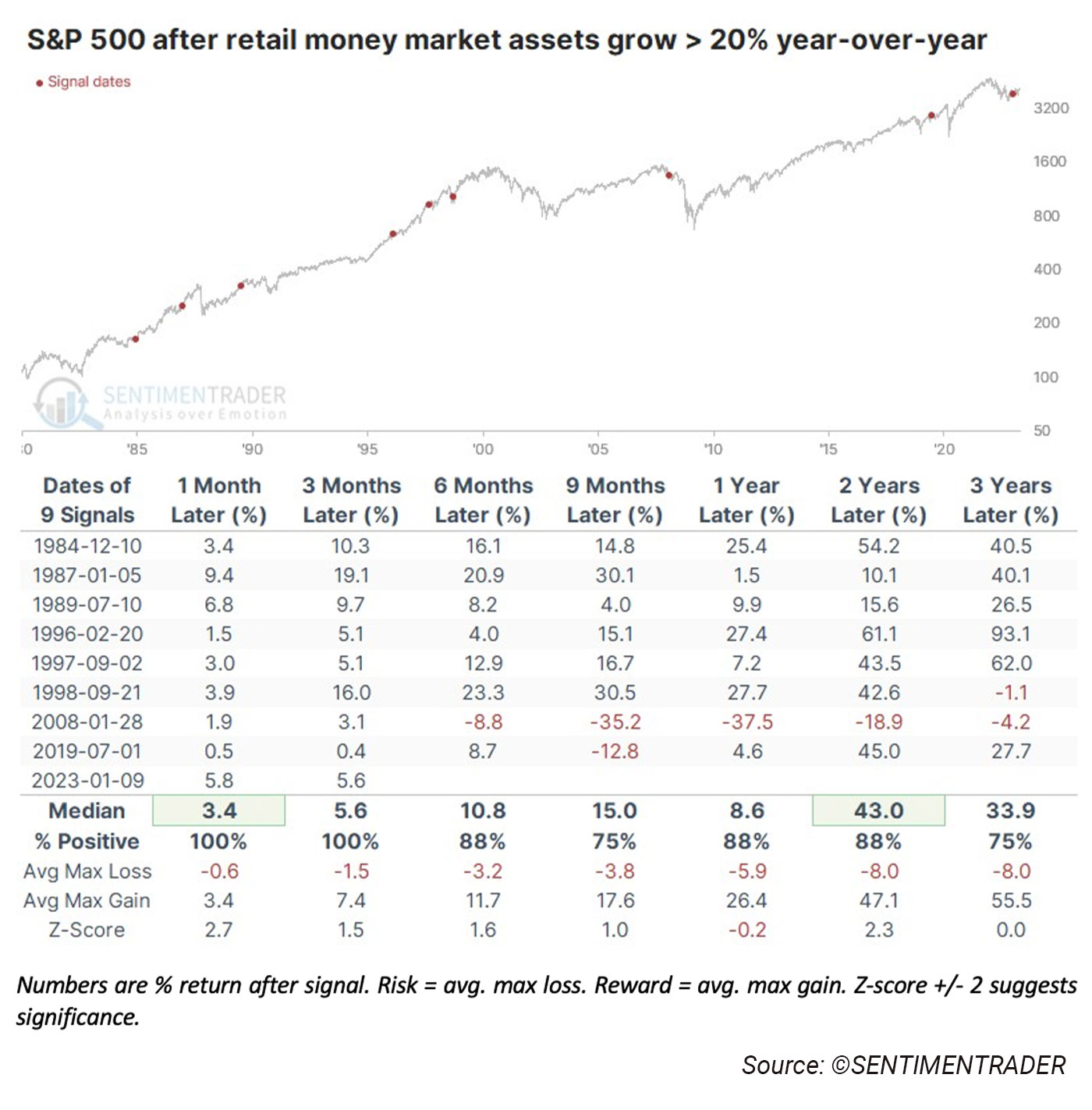 Except for 2008, history suggests that the times when investors have rushed into money markets can be a good time to buy stocks. Even in 2008, that held for the first three months following a 20% increase in money-market assets, like we are experiencing today.