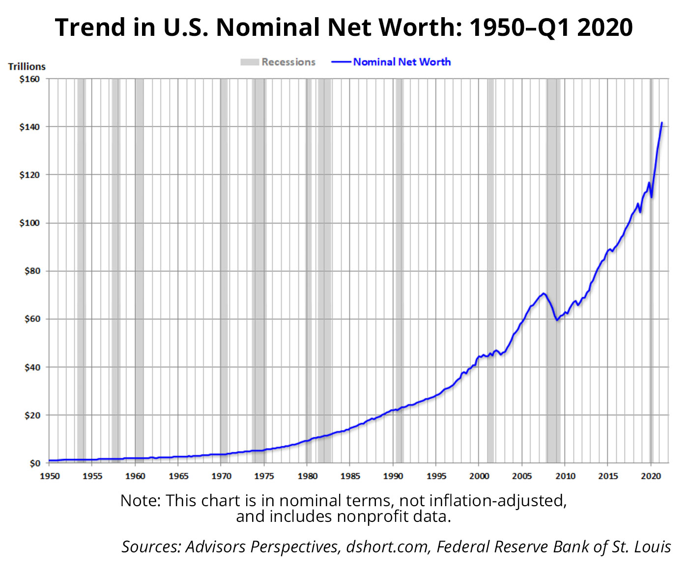 According to The Federal Reserve Bank of St. Louis, the net worth of U.S. households and nonprofit organizations rose from $44.2 trillion in 2000 to a pre-recession peak of $67.7 trillion in the third quarter of 2007. It then fell $13.1 trillion to $54.6 trillion in the first quarter of 2009, about a 20% decline.