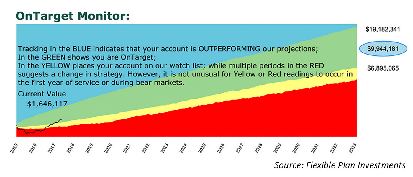 At our firm, we seek to minimize this tendency to focus on short-term results (technically called “narrow framing”) by providing a long-term chart called our OnTarget Monitor. It puts performance in a long-term perspective based on an established goal and the likely performance of the mix of strategies chosen by each client.