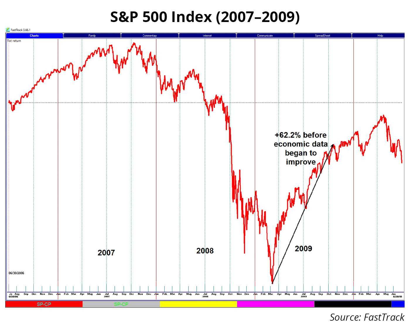 First, let’s take a look at the 2007–2009 financial crisis. The following graph illustrates the S&P 500 during that period. Stocks began deteriorating in late 2007 and early 2008, while the economy (by all news headline accounts) was still apparently healthy. Nonetheless, our strategies, following a predetermined set of rules, generally took action to reduce exposure to stocks even though the economic news at the time was quite good.
