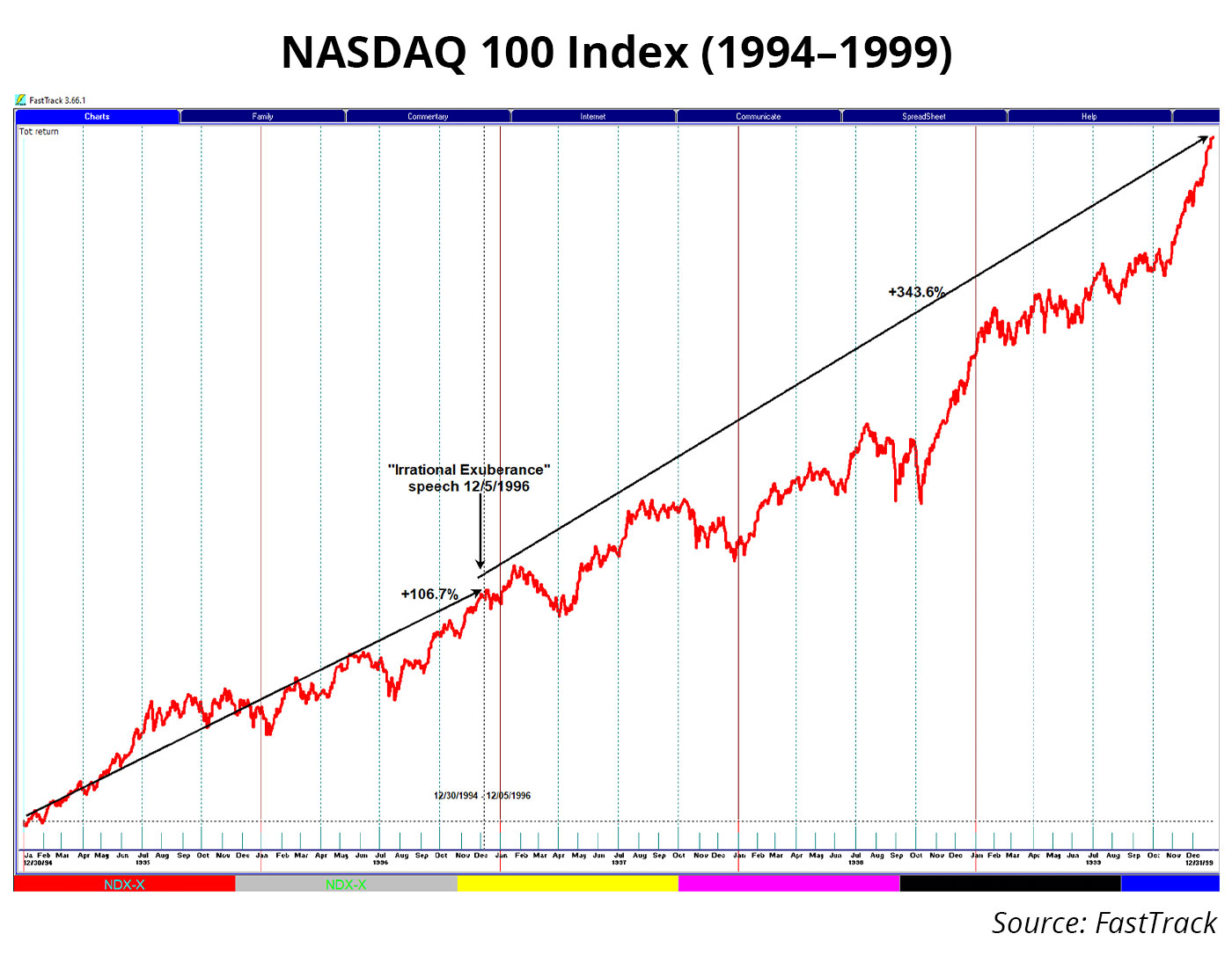 Now let’s take a look at another memorable example from the late 1990s. In late 1996, following a significant move up in the stock market (as measured by the NASDAQ 100 Index), then Chairman of the Federal Reserve Board Alan Greenspan gave a speech in which he referred to investors as having “irrational exuberance.” Based on many historical measures, he was right, and the stock market corrected for several days thereafter. Stocks then advanced significantly higher over the next three-plus years.