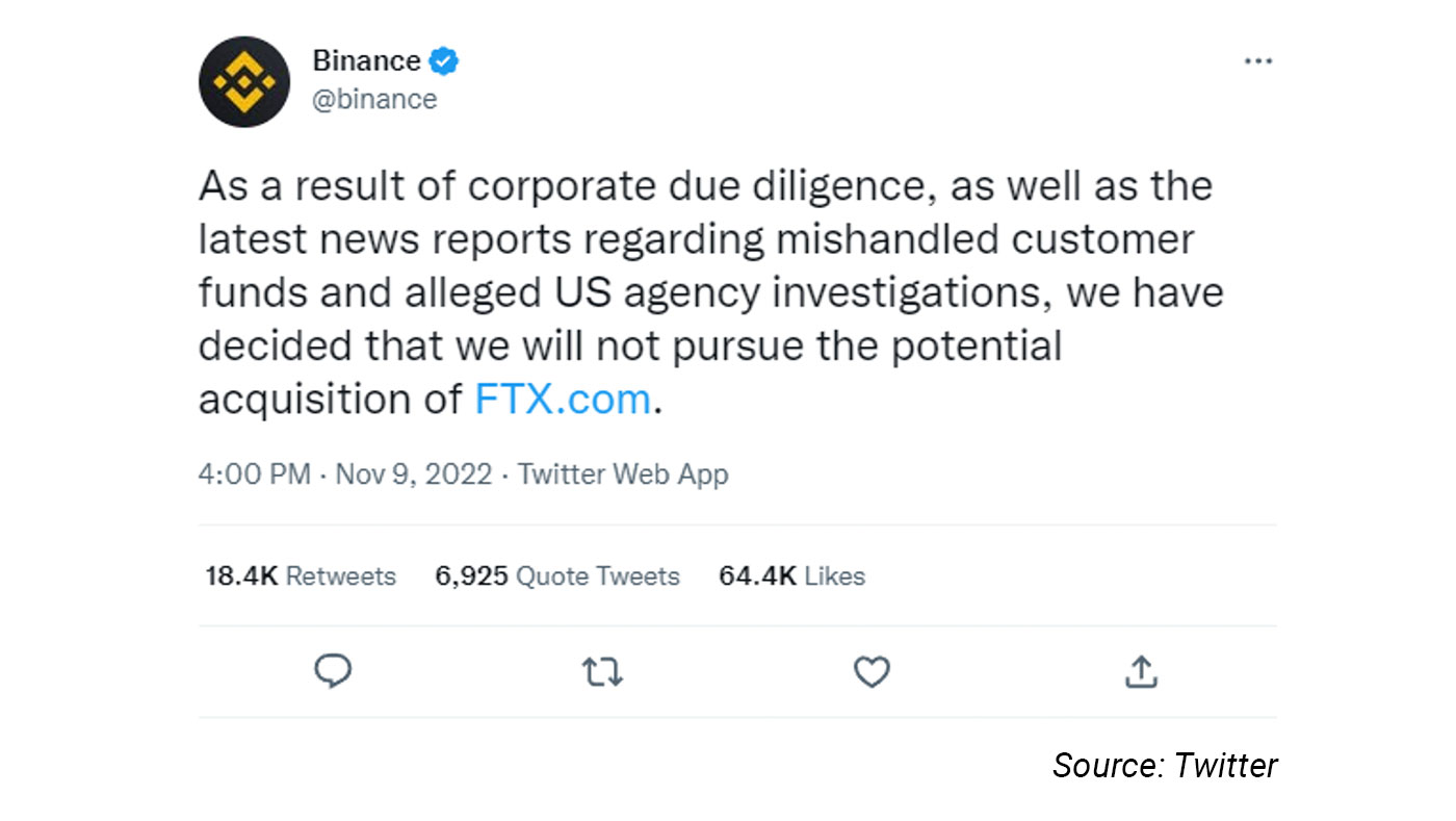 But the following day, November 9, Binance tweeted, “As a result of corporate due diligence, as well as the latest news reports regarding mishandled customer funds and alleged US agency investigations, we have decided that we will not pursue the potential acquisition of FTX.com.”
