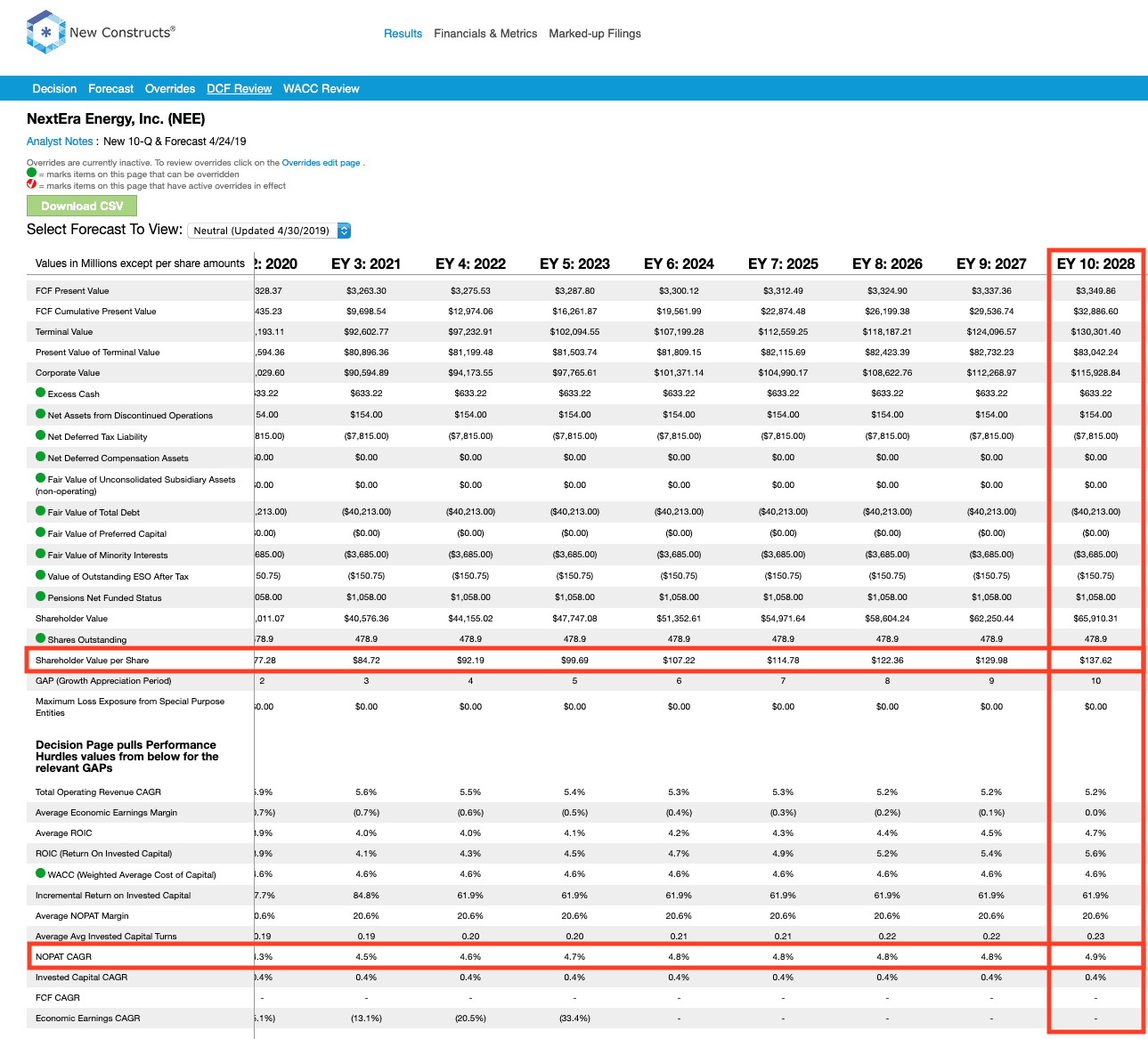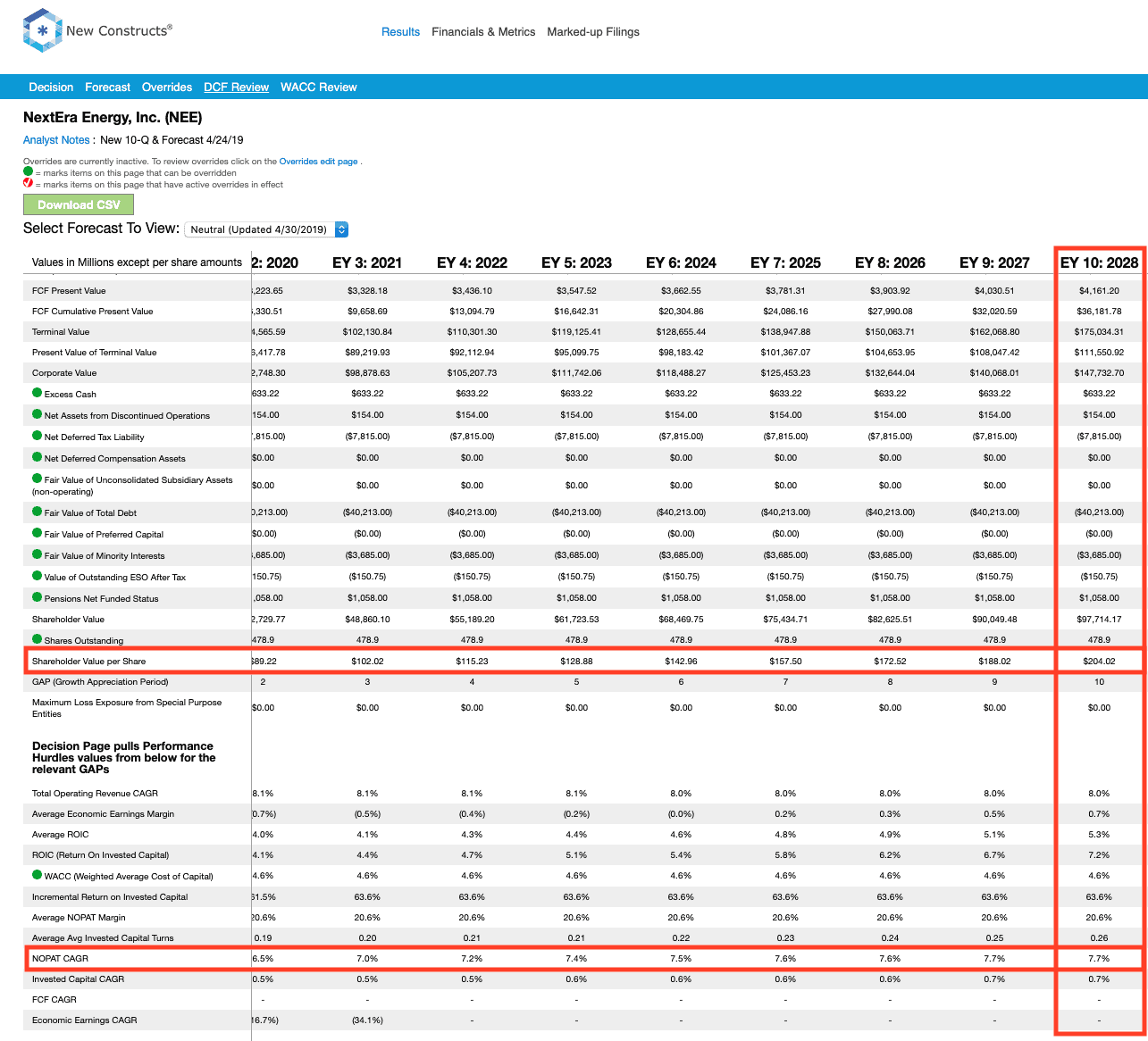 Even if NEE can maintain current margins and grow NOPAT by the historical rate of 5% compounded annually for the next decade, the stock is worth just $138/share today – a 32% downside. See the math behind this dynamic DCF scenario.