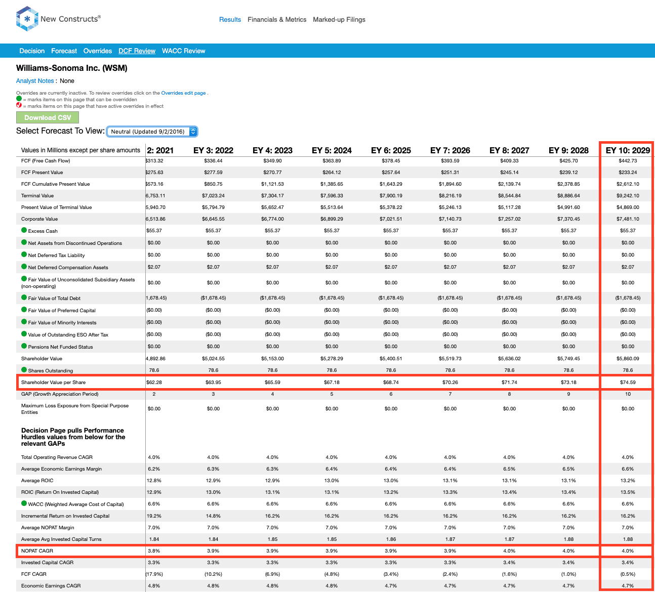 If WSM can maintain current NOPAT margins (7%) and grow NOPAT by just 4% compounded annually for the next decade, the stock is worth $75/share today – a 32% upside. See the math behind this dynamic DCF scenario.