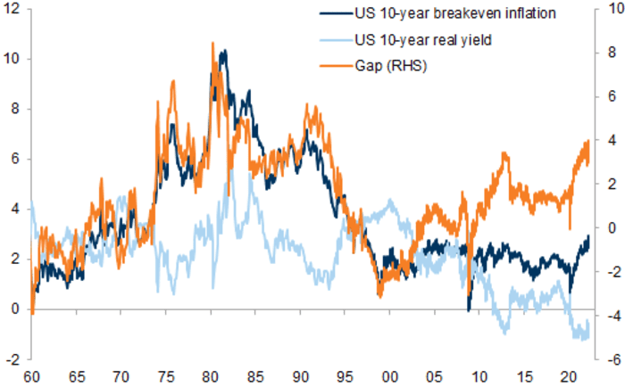 Signs of stagflation worries are evident in rates markets. The 10-year U.S. breakeven inflation rate, a gauge of inflation expectations, has reached its highest level since the 1990s, according to Goldman Sachs. Meanwhile, inflation-adjusted real yields remain near their lowest levels in decades, reflecting pessimism about economic growth in coming years. And the widely followed spread between 2-year TMUBMUSD02Y, 1.944% and 10-year Treasury yields is inching its way closer to an inversion, typically a harbinger of recession.