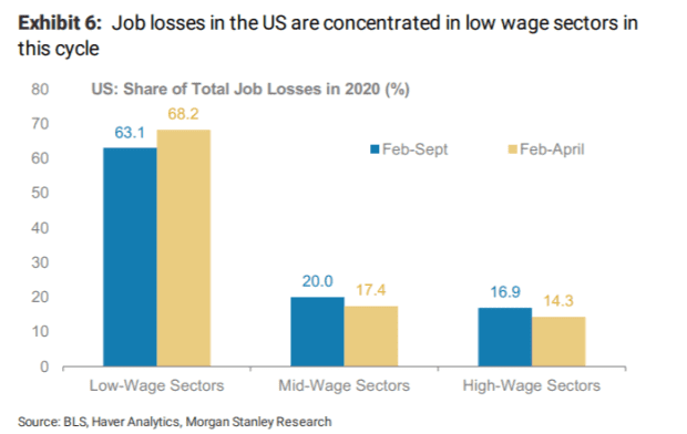 Morgan Stanley’s global economics team is more upbeat, saying the world economic recovery will continue, if moderate, through the winter. The team bluntly notes the unemployment during the pandemic has been focused on low-wage industries. At the peak in April, 68% of all employment losses were concentrated in low-wage industries, which accounted for only 43% of pre-COVID payrolls in February.